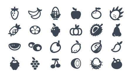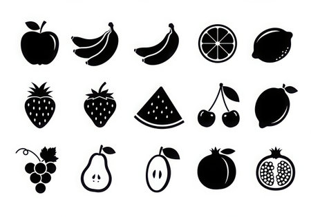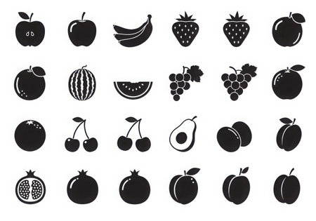 A grid of various fruit icons in silhouette style, presented clearly on a white background.