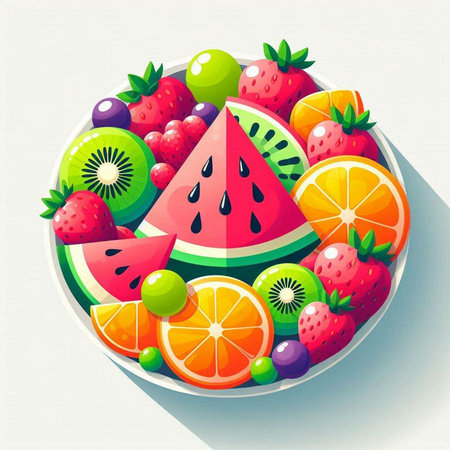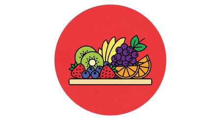 a vibrant illustration of assorted fruits including strawberries grapes and kiwi on a red background