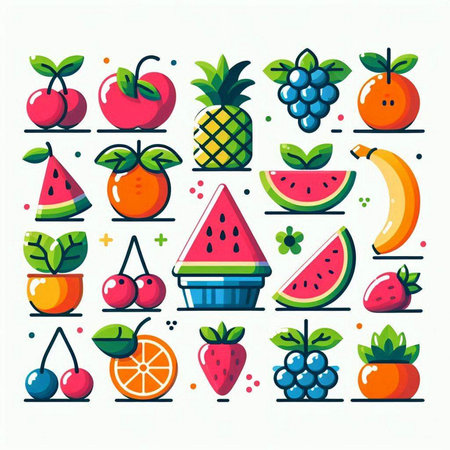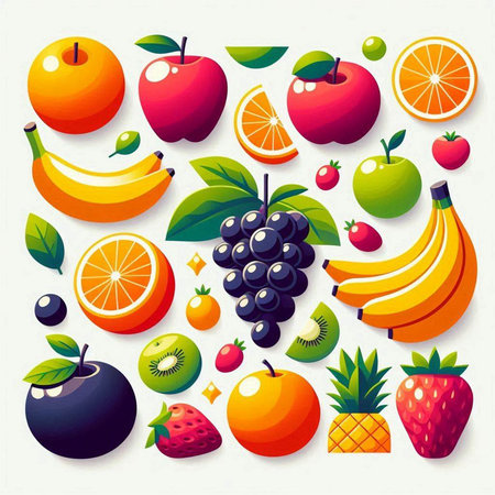 A collection of various fruits illustrated in a simple and colorful manner. The image includes apples, oranges, bananas, pears, strawberries, grapes, pineapples, watermelons, lemons, and pears.