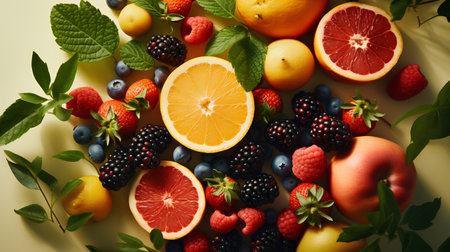 Juicy fruits top view background. Al generated illustration