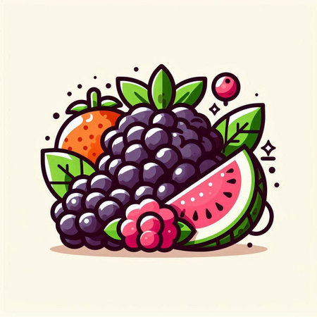 Fruit vector illustration. Hand drawn blackberry, watermelon, melon and raspberry.