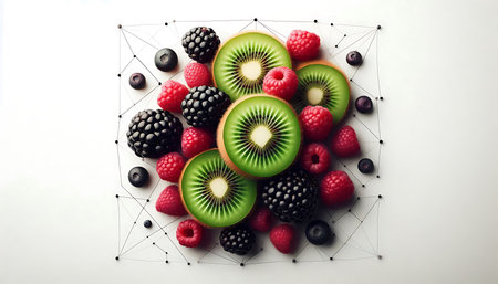A vibrant display of assorted fresh fruits including strawberries, blueberries, lemons, and kiwis arranged artfully on a light background, perfect for health-related projects.