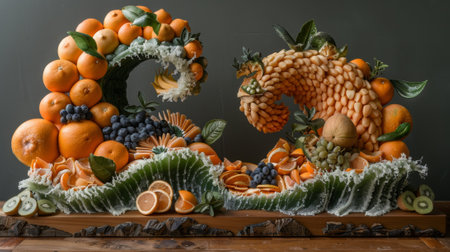 A sculpture of a wave made out of fruit and vegetables, AI