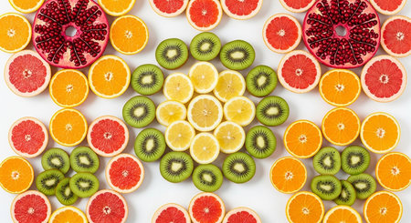 A vibrant array of assorted sliced fruits forming a circular pattern.