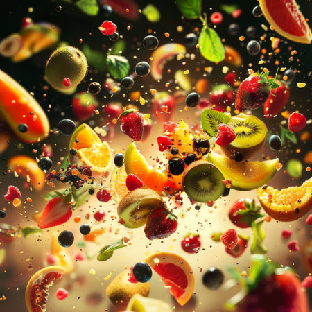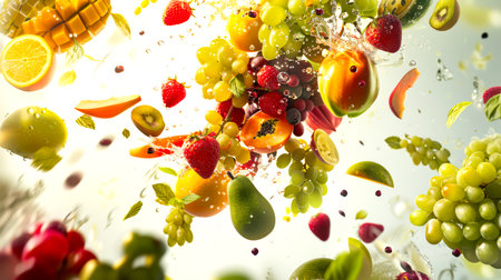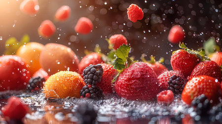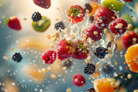 This dynamic image captures a vibrant splash of fresh fruits in a stunning display. Various berries mingle with citrus, creating an appetizing and refreshing scene perfect for culinary inspiration.