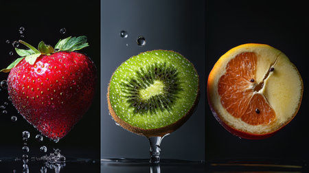A strawberry, kiwi, and orange half levitate with water drops around them against a black background.
