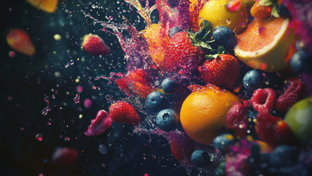 A vibrant explosion of colorful fruits and splashes, representing the energy from fruit juice. The background is dark to highlight the colors and textures of various fruits like oranges, strawberries, blueberries, lemons, and others, creating an attractive visual for advertising or product design. --ar 53:30 --v 6.1 Job ID: 0ca558c6-de95-4e07-95f6-b96040bcbaf2