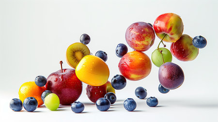 collection of vibrant mixed fruits including apples, oranges, grapes, pears, and kiwis hover in a minimalist studio setting. The assortment of fresh fruits is arranged artistically against a clean, neutral background, highlighting their colorful and natural appeal. This image captures the essence of healthy eating and natural beauty in a simple, yet striking manner