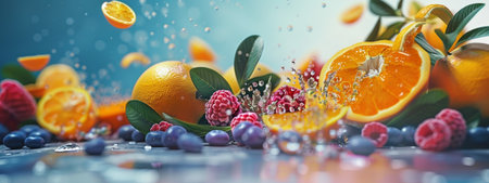 A dynamic scene of citrus fruits and berries captured mid-splash in water, with droplets frozen in the air. The vibrant colors and motion convey freshness and energy.