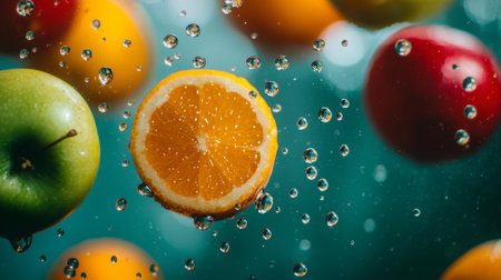 Vibrant image of fresh fruits like apple, orange, and cherries floating in water with suspended droplets, creating a dynamic and refreshing composition representing healthy, fresh food and hydration.