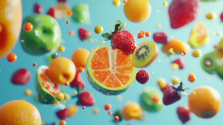 A vibrant image of fruits such as strawberries, kiwis, and lemons floating weightlessly like balloons,