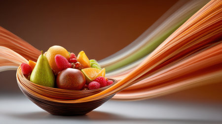 A striking composition featuring an assortment of fresh, colorful fruits in a decorative bowl, accented by vibrant swirling colors that evoke energy and vitality.