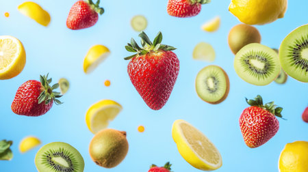 A dynamic composition of various fresh fruits, including oranges, strawberries, and kiwis, floating against a vibrant blue background.