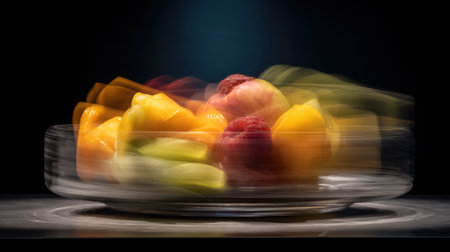 A stunning visual of a vibrant assortment of fresh fruits displayed on a plate, captured in motion to highlight their colorful appeal and freshness.