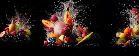 Fruit splashes on a black background, with various fruits such as pineapple and coconut falling into the water, creating an abstract composition. The splash of fruit is dynamic and colorful against the dark backdrop, offering space for text or copy in the center. This scene captures fresh fruit flying through the air, adding vibrancy to any design. High-resolution photography, detailed, and a professional lighting setup. --ar 33:10 --v 6.1 Job ID: 6616a222-6081-411e-90f0-fb94279488b2