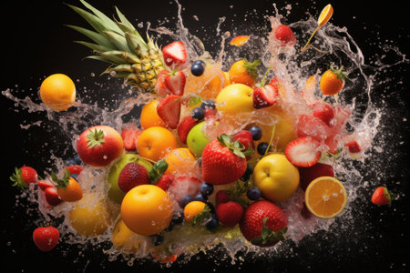 A vibrant display showcasing a dynamic explosion of various fresh fruits and vegetables with a dramatic water splash on a dark background.