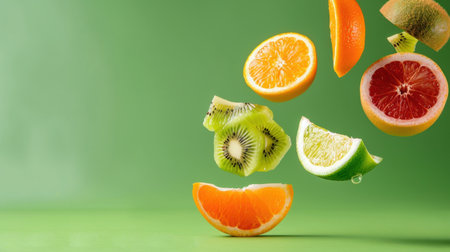 This captivating image features a dynamic arrangement of assorted fruits, including citrus varieties, set against a bright green backdrop. Ideal for health-related projects.
