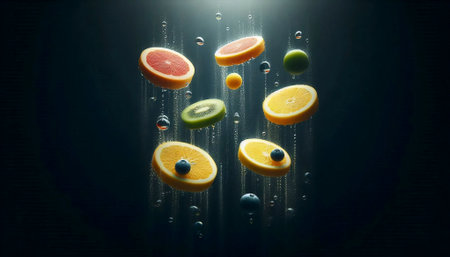 Surreal floating fruit slices with water droplets suspended in mid-air against dark background, Ai created image
