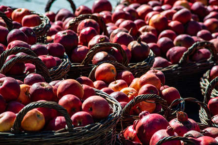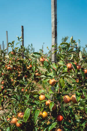 Beautiful ripe red apples on branches in orchard garden against blue sky. Organic sweet fruits hanging on apple trees at farm. Eco natural background. Sunny summer, autumn day in countryside.