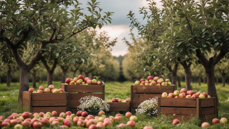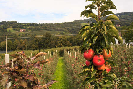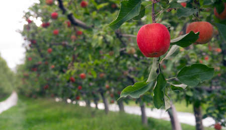 Apple orchard in autumn. Rows of apple trees with ripe red apples.