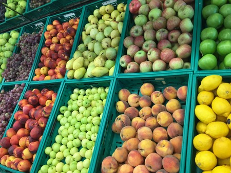 Variety of fresh fruits and berries including apples, oranges, grapefruits, pears, cherries, pears, kiwi, pears, pears, grapes, plums, lemons, grapefruits and oranges.