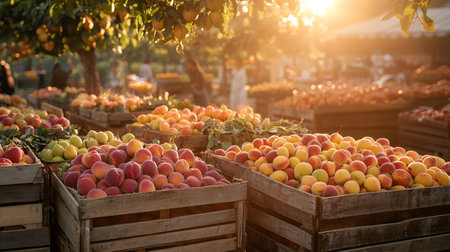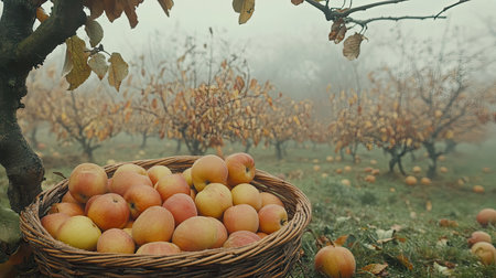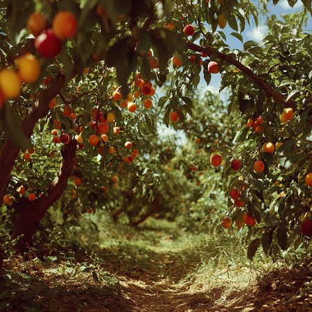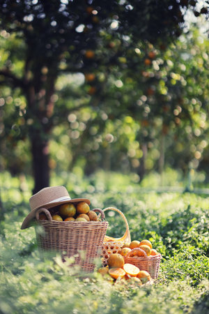 Golden sunlight filters through an orchard filled with ripe fruit, highlighting oranges and a nearby basket.