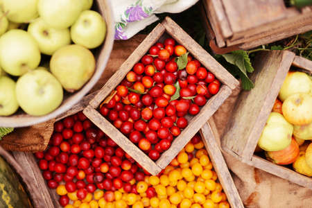 ripe juicy fruits and berries are in cardboard boxes summer day on the market. top view