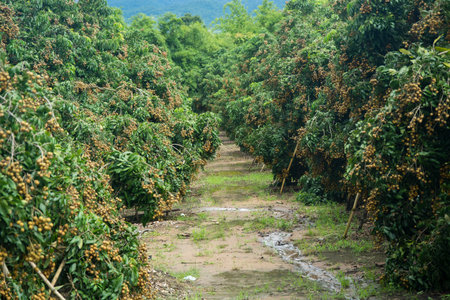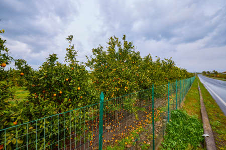 Orange citrus fruit plantations with rows of orange trees on Peloponnese, Greece, new harvest of sweet juicy oranges