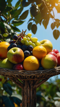 A colorful assortment of fresh fruits, including apples, pears, oranges, grapes, lemons and strawberries, arranged in a rustic basket on a wooden table in a lush garden setting