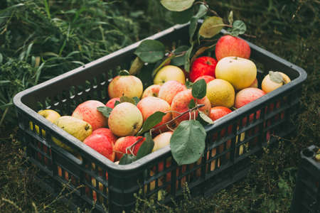 Exotic summer diet. Tropical organic fruit in crate. Apple, plam, pear delivery . Autumn harvest. Stock photo.