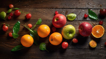 Fresh fruits and vegetables on wooden table. Healthy food concept. Close up.