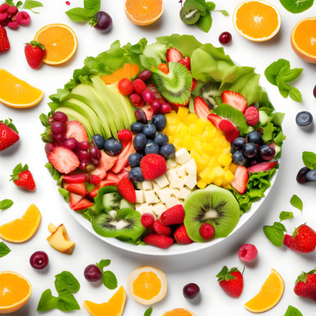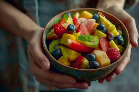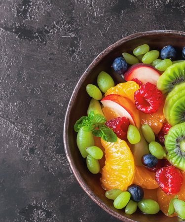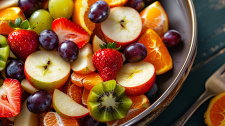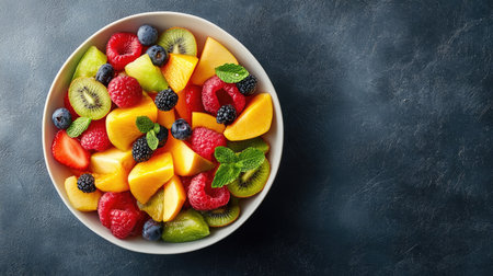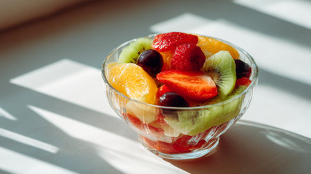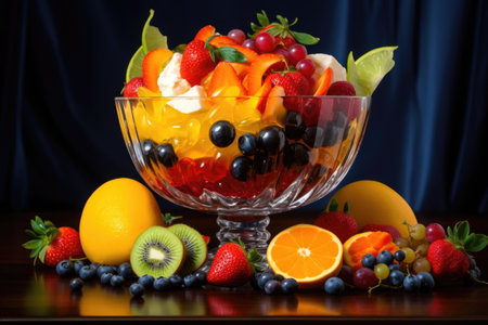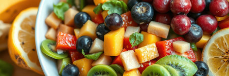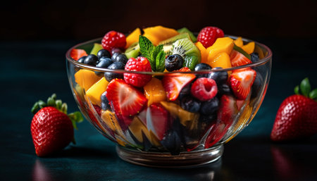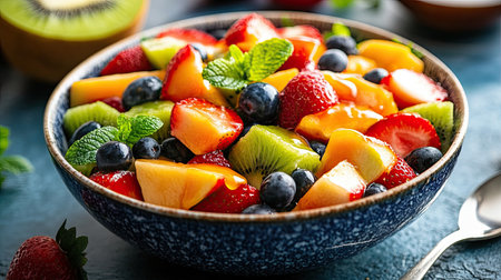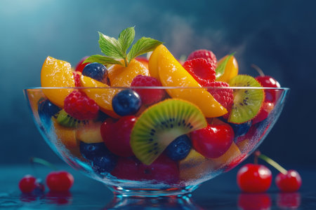 Vibrant and colorful fruit salad in glass bowl with fresh garnishes and juicy textures