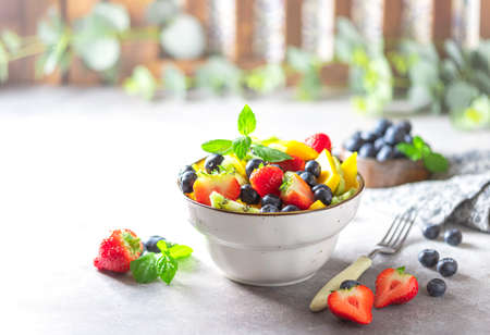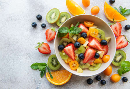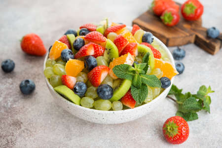 Fresh organic fruit salad on a light concrete background. Copy space.