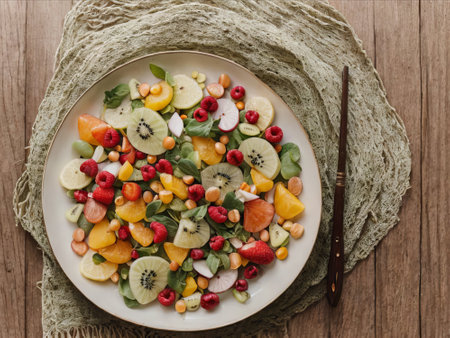 Discover a vibrant and colorful arrangement of fresh fruits, nuts, and greens perfect for a nutritious meal or snack, offering a visually appealing healthy choice.