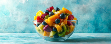A fresh and colorful bowl of fruit salad featuring mixed berries, kiwi, and mango on a textured blue background, ideal for promoting healthy eating, summer vibes, and natural food.