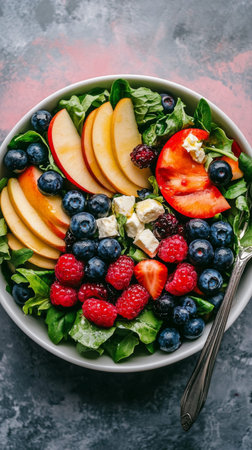 A vibrant breakfast bowl filled with fresh greens, sliced apples, and a colorful mix of berries including blueberries, raspberries, and blackberries, ideal for a healthy start.