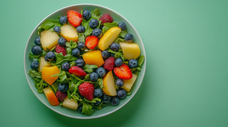 A vibrant fruit salad with a variety of fresh fruits, with ample space for copy