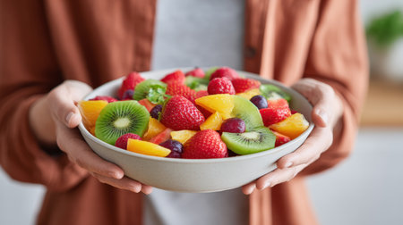Female figure presents a bowl of assorted fresh fruits, featuring strawberries, kiwi, and peaches, emphasizing nutrition and healthy living in a bright kitchen setting