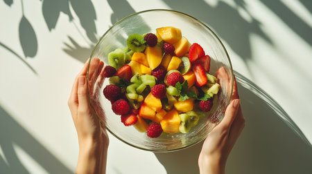 A close-up of hands holding a glass bowl filled with vibrant, fresh fruit salad, featuring kiwi, strawberries, grapes, blueberries, and mango slices.