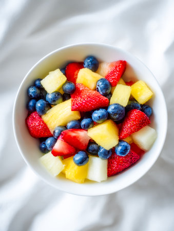 A vibrant medley of ripe berries, juicy pineapple chunks, and tender melon slices arranged invitingly in a colorful bowl, perfect for a refreshing snack or healthy breakfast.