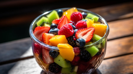 fruit salad with mixed berries and kiwi in glass bowl, vibrant colors. healthy eating and summer refreshment concept