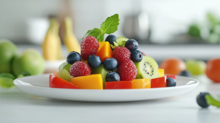 A beautiful fruit salad arrangement featuring a mix of berries, kiwi, and mango, garnished with a mint leaf, perfect for healthy snacking or desserts in a bright kitchen.