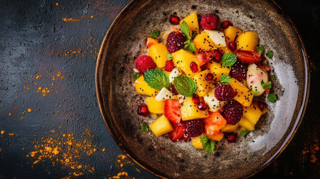 A vibrant fruit salad featuring raspberries, mango, and pineapple garnished with fresh mint, beautifully presented in a rustic bowl on a textured background. Ideal for healthy dining.
