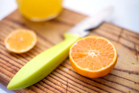 Mandarin Orange cut on a wooden board and a glass of orange juice.