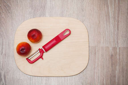 A kitchen tool for peeling vegetables is lying on a wooden board