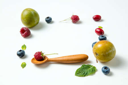 Mixed fruit on wood side view - Berries and lemon with papaya at the center of the composition - Focus on papaya blurred background