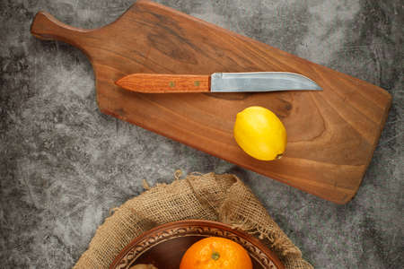 A wooden anchorage on which a lemon on a towel and a tool for squeezing juice on a gray background. View from above