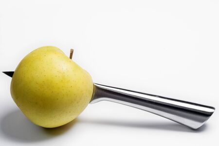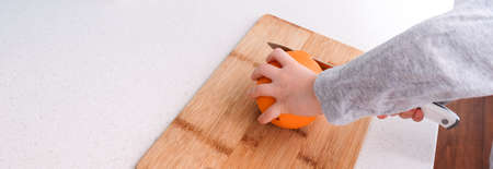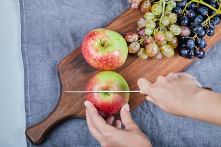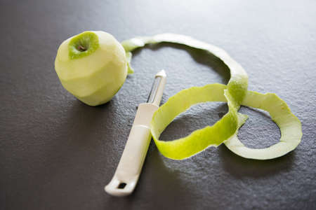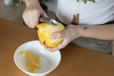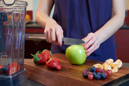Cooking food at home in the kitchen, closeup of womans hand with knife cutting an apple skin