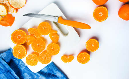 Fresh clementines, oranges on board with green leaves with a knife. Top view on a yellow background