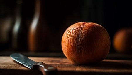 Juicy citrus slice on rustic cutting board, perfect healthy snack generated by artificial intelligence